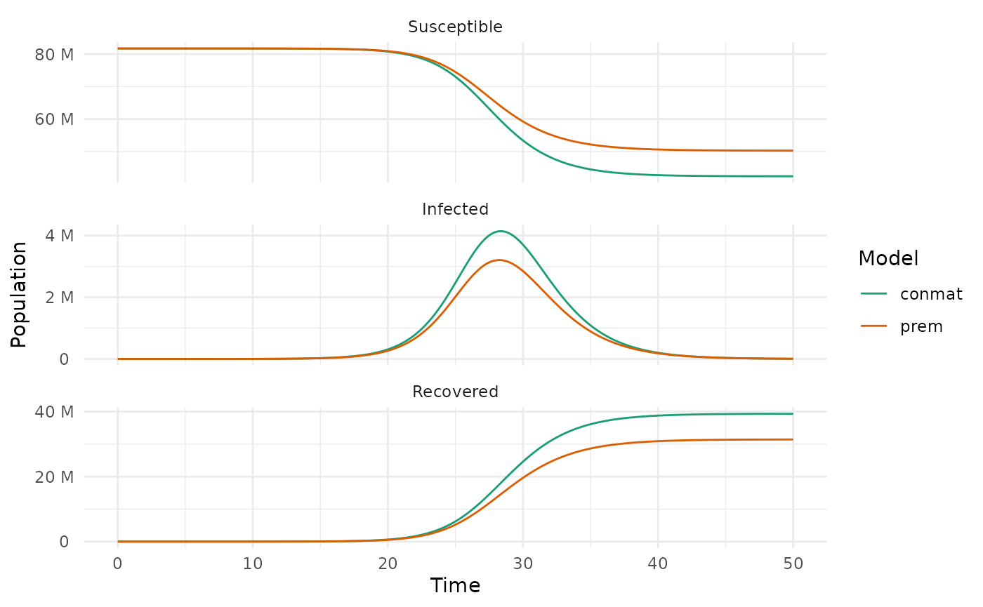 #> [1] 0.5805693We can adjust our contact matrices with these factors, and then our R0s will be the same, meaning that the only difference between the two models should be differences in the contact matrices.