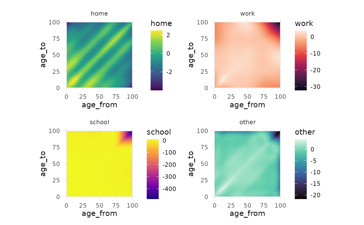 Partial predictive plots give a visual representation of the effect of each covariate on the model, or (equivalently) the effect of each setting on the total contact matrix. Positive values indicate more contacts in that region of the matrix compared to the null case, while negative values indicate less.